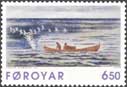 He also designed a Christmas seal (right) in 1985 based on the Northern Lights theme. His first postage stamps were released in 1996 which included three different values. Kamban's "Birds and Fishing Boat" done in 1996 looks similar to the back of the first 5 Kroner Faroes Islands banknote issued in 1951.