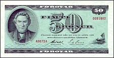 The motifs on the back depict Faroese landscapes drawn by two renowned local artists. Janus Kamban (left) a pioneer sculpture was born in Tórshavn in 1913 and studied in Denmark. When he finished his studies after World War II he returned to the Faroes. Kamban then began to organize local art exhibitions which contributed to the newfound popularity of art in the Faroes.