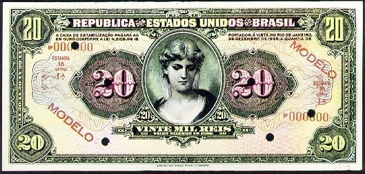 Issued in 1926, together with other notes with values from 1,000 to 10 Réis, this note was exchanged for gold ingots and coins, with the purpose of building a reserve to make Brazilian money stronger.