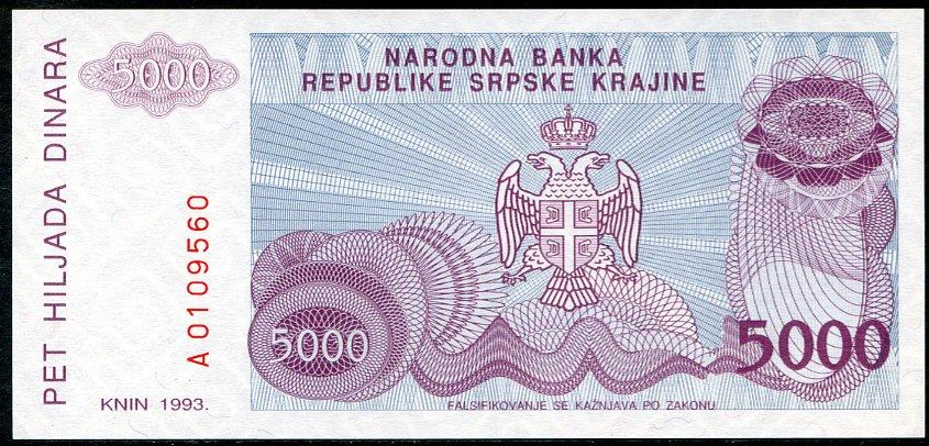 ![]() P.R20a 5,000 Dinara Knin 1993 DC |