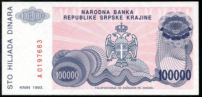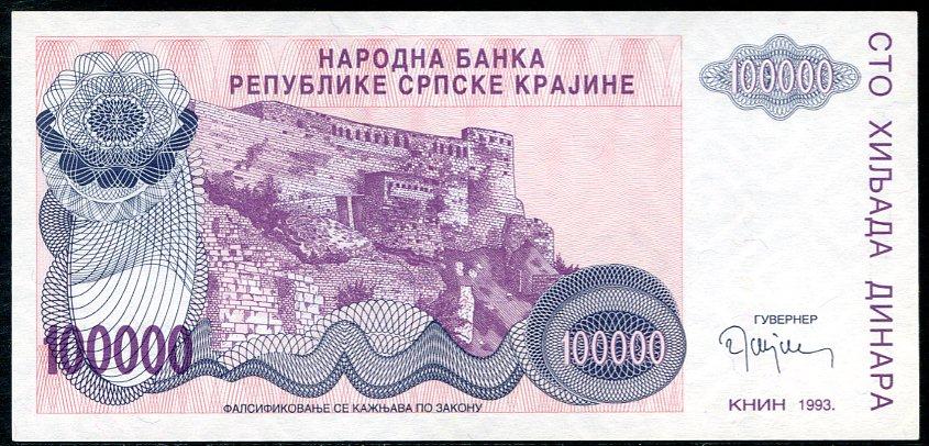![]() P.R22a 100,000 Dinara Knin 1993 DC |