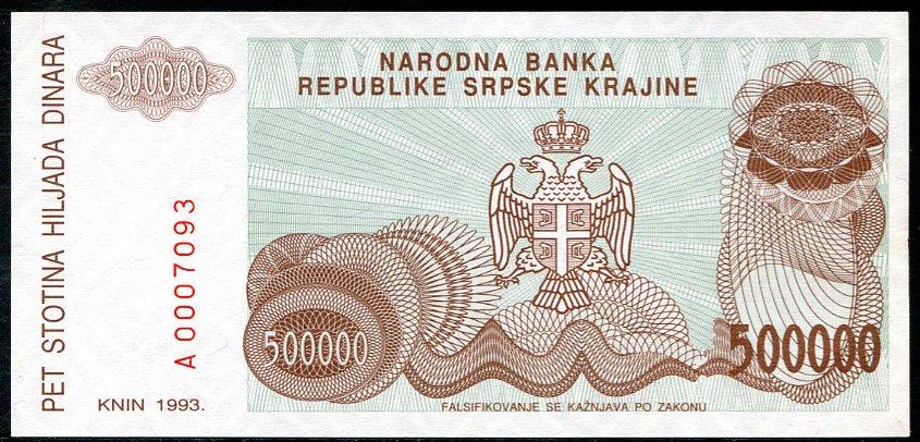 ![]() P.R23a 500,000 Dinara Knin 1993 DC |