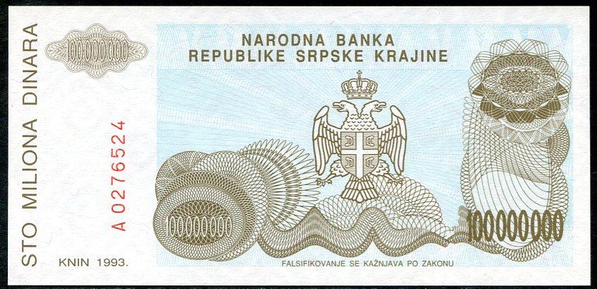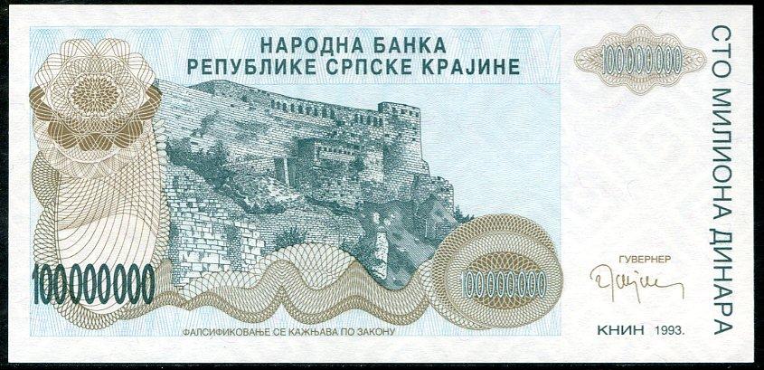 ![]() P.R25a 100 Million Dinara Knin 1993 DC |