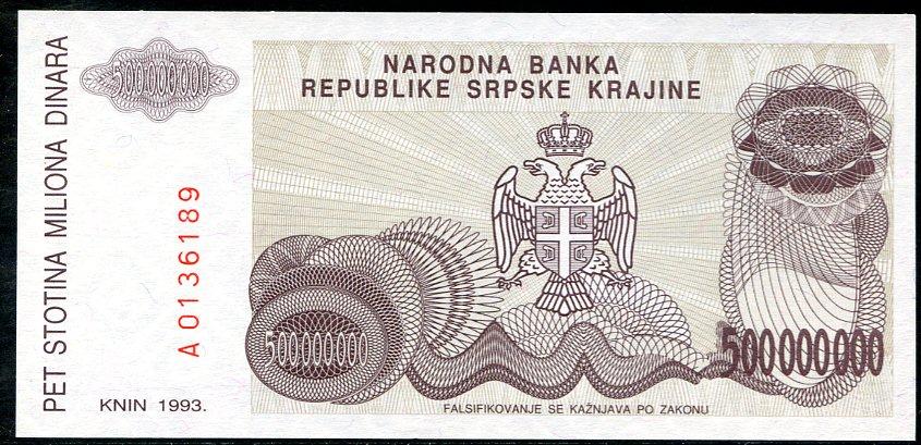![]() P.R26a 500 Million Dinara Knin 1993 DC |