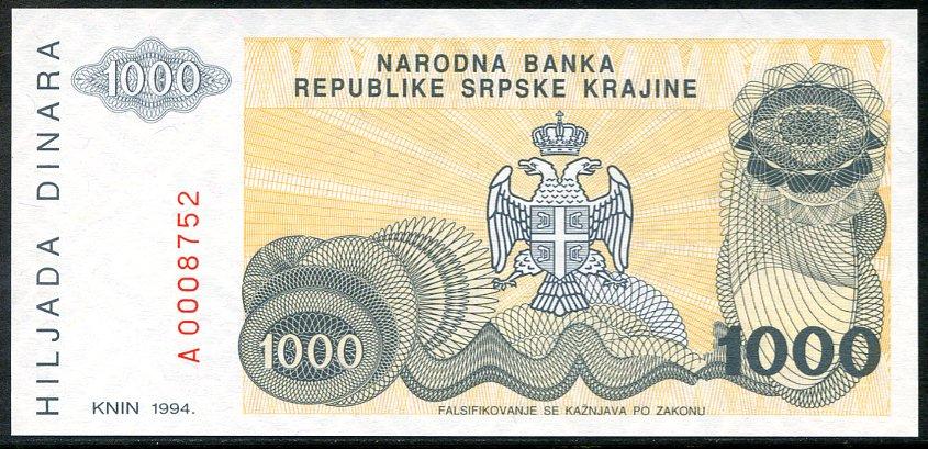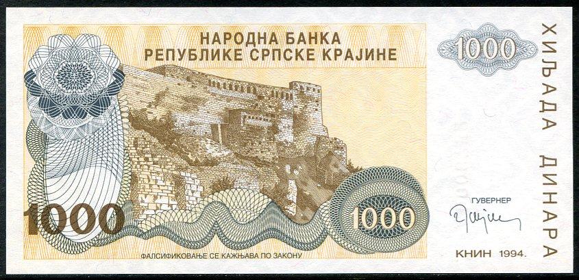 ![]() P.R30a 1,000 Dinara Knin 1994 DC |