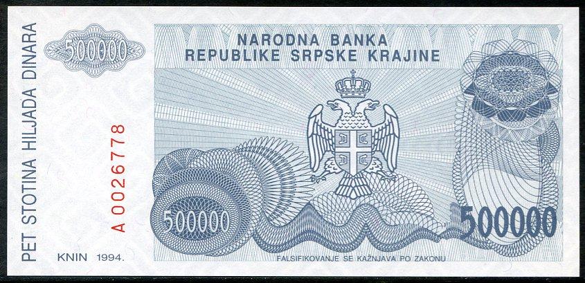 ![]() P.R32a 500,000 Dinara Knin 1994 DC |