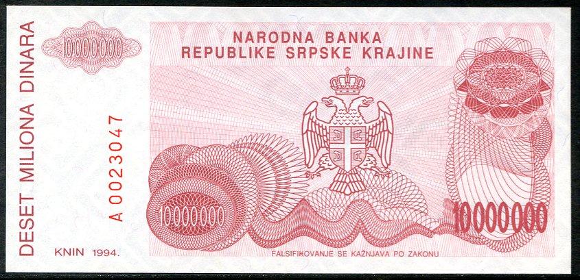 ![]() P.R34a 10 Million Dinara Knin 1994 DC |