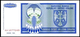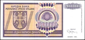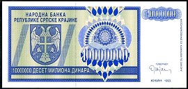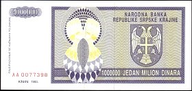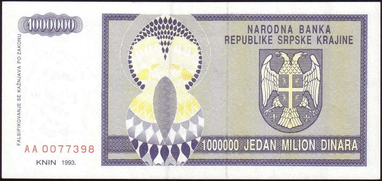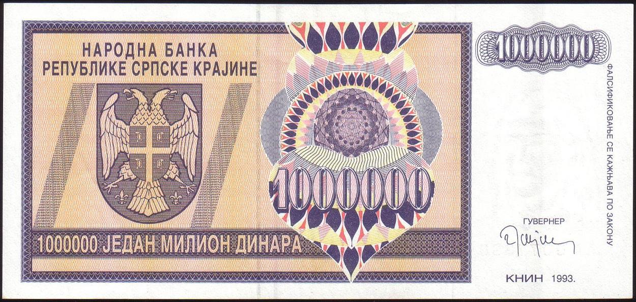 ![]() P.R10a 1 Million Dinara Knin 1993 BA |