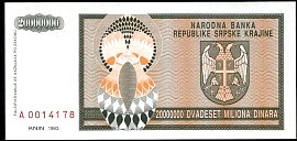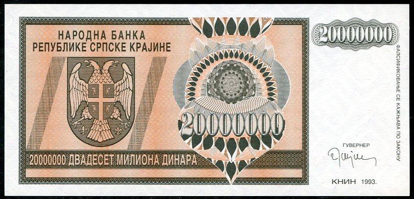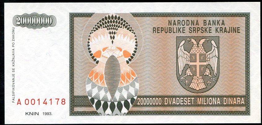 ![]() P.R13a 20 Million Dinara Knin 1993 DC |