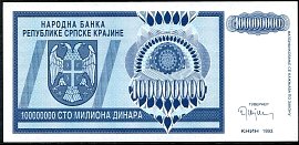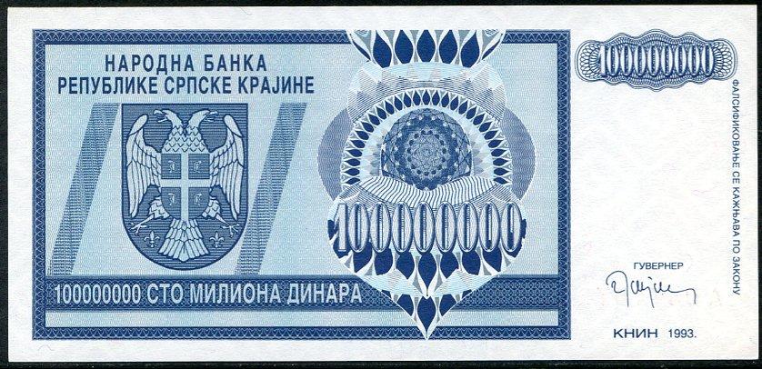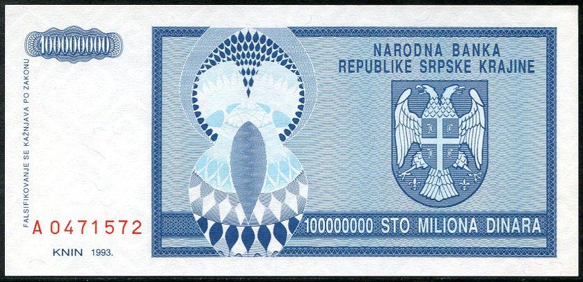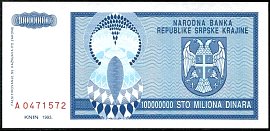 ![]() P.R15a 100 Million Dinara Knin 1993 DC |