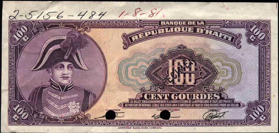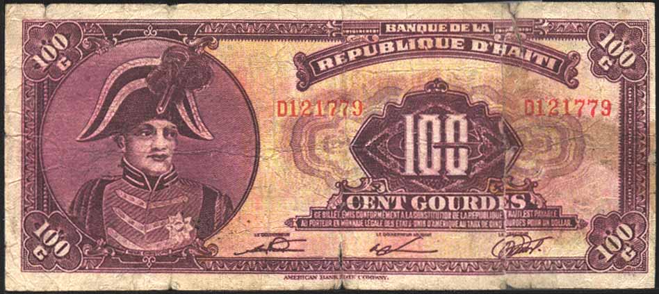 ![]() N.1091X, P.236X 100 Gourdes COUNTERFEIT?, Sig: T |